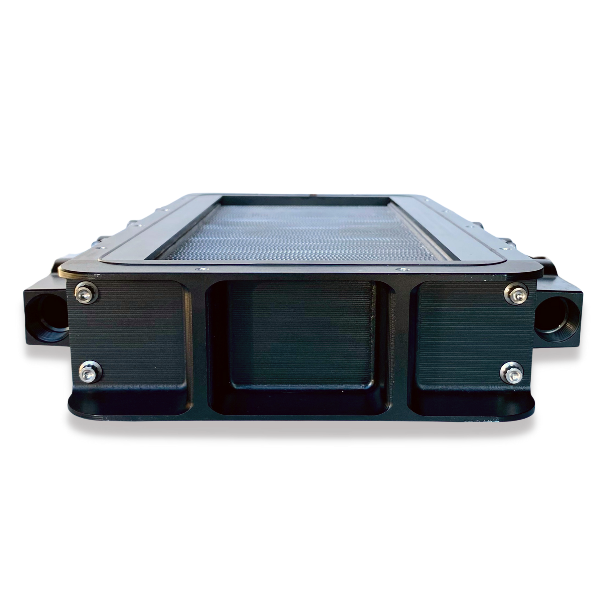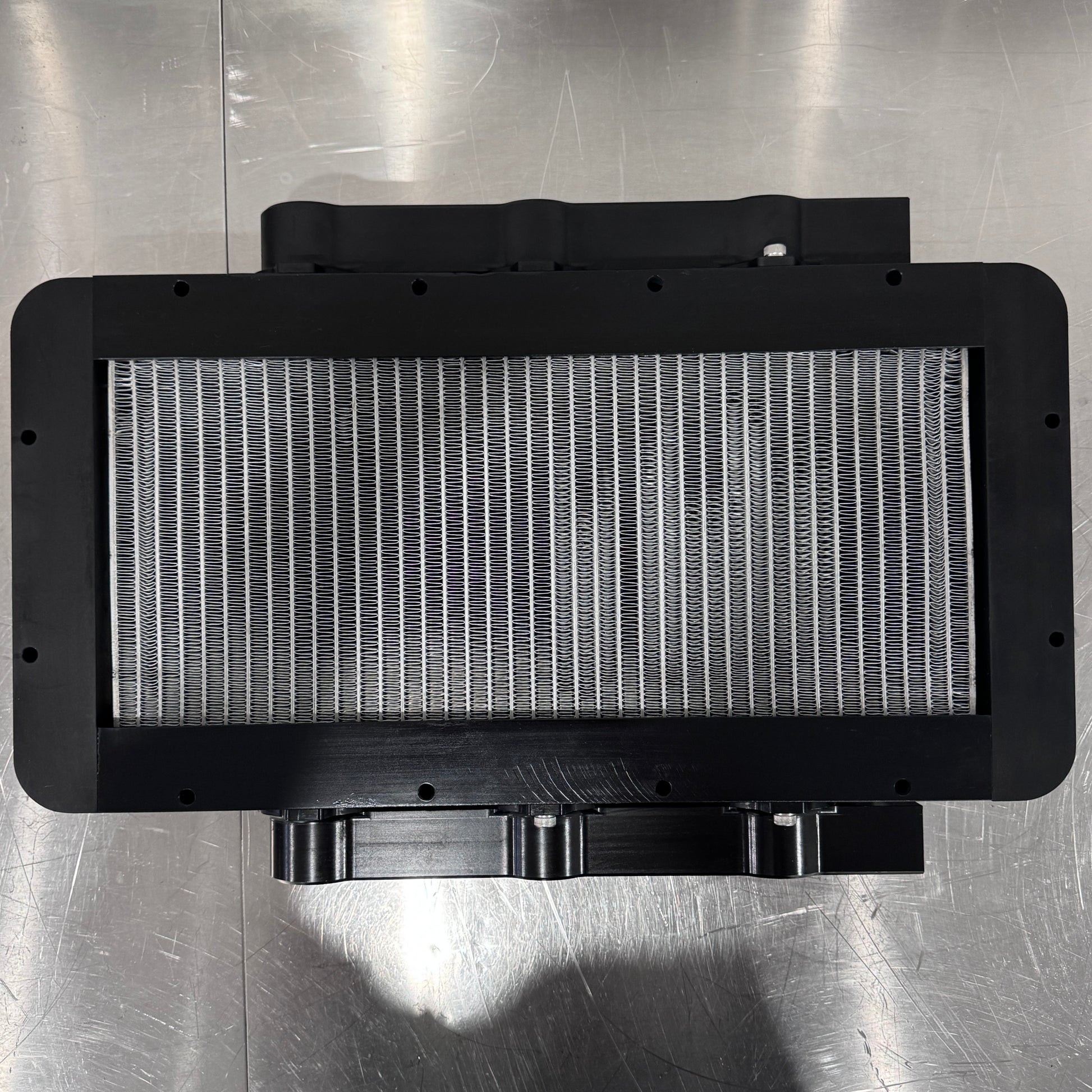 Tapped with -12 fittings, the water logs flow chilled water in one side, through the genuine PWR tube and fin core, and out the other side. The end tanks have been designed to flow water via the shortest path across the core. It is then returned to the ice box or front mount heat exchanger.